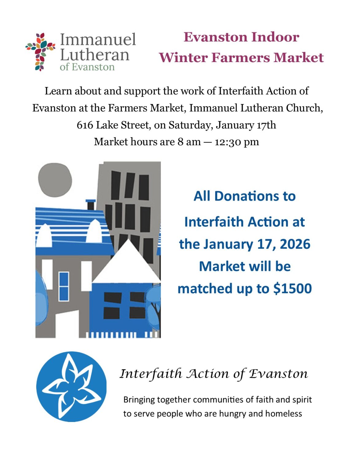 On Sat. January 17, 2026 at the Indoor Farmers’ Market, learn about the work of Interfaith Action. All donations to Interfaith Action at the market that day will be matched up to $1,500.